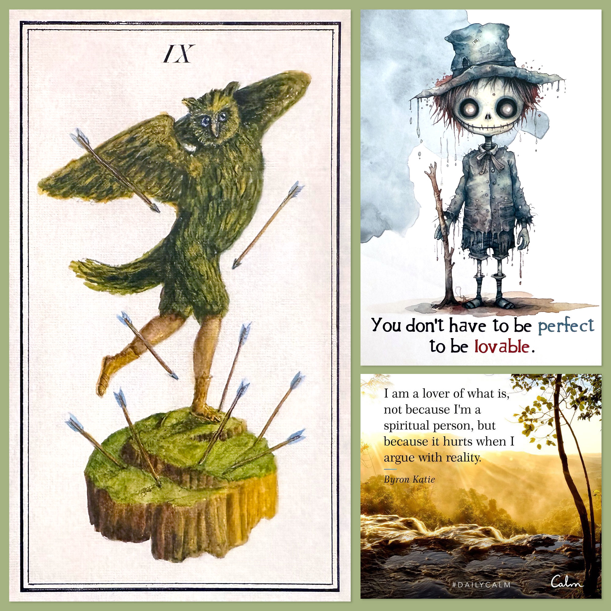 The Ace of Cups has then been combined with a Halloween Affirmation card that says, “Stop calling yourself garbage. You’re a shimmering star. You are amazing.”