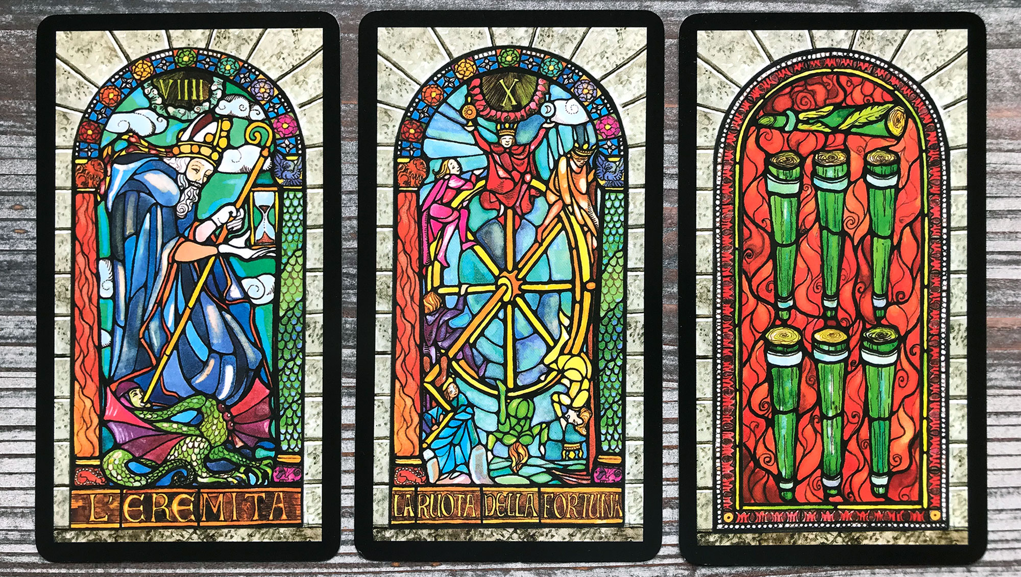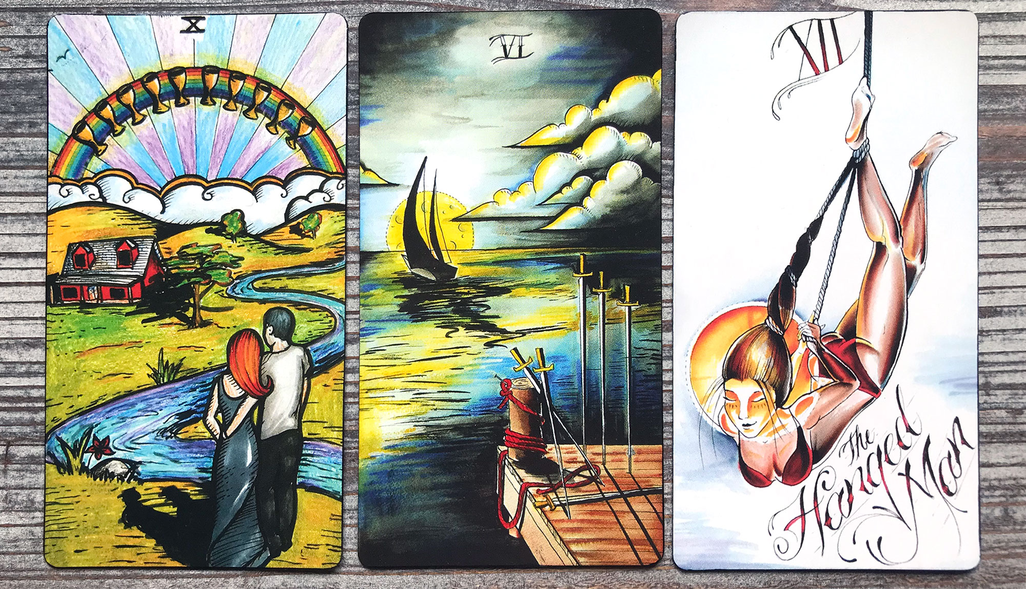What we see here between the cards in this reading is the carry over of pink through the three cards in the spread. In this case, the Temperance card speaks the loudest here due to it’s greater saturation of pink, and then spreads it’s influence to the other cards in the spread to highlight the aspects that carry the most weight in each of the other two cards.
