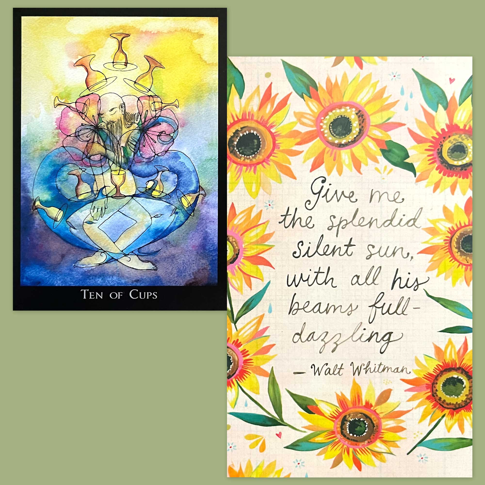The Walt Whitman quote in the affirmation card today goes well with the theme of the Ten of Cups, as it is all about finding what makes you happy and gives you peace… and sinking into it. So often, we reject the things that could make us happy either through lack of believing that we don’t deserve it, or because we feel it’s “not the right time”. Today’s cards say that now is the right time, and you do deserve to be happy. Don’t push it away… embrace it.