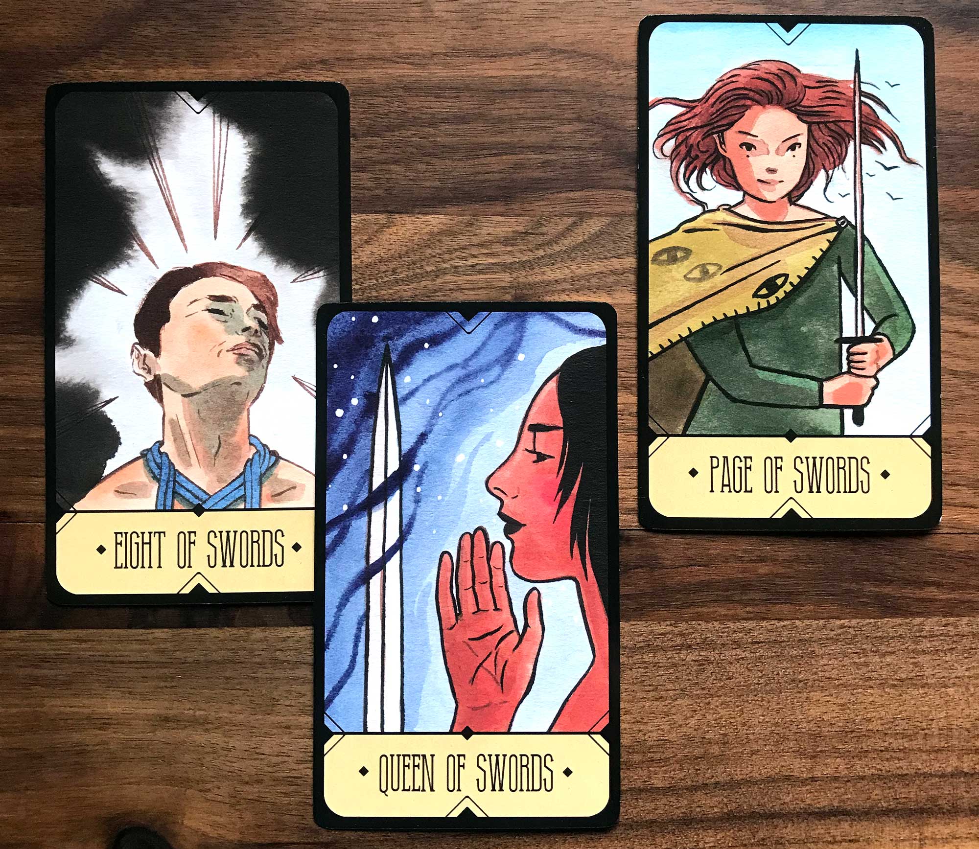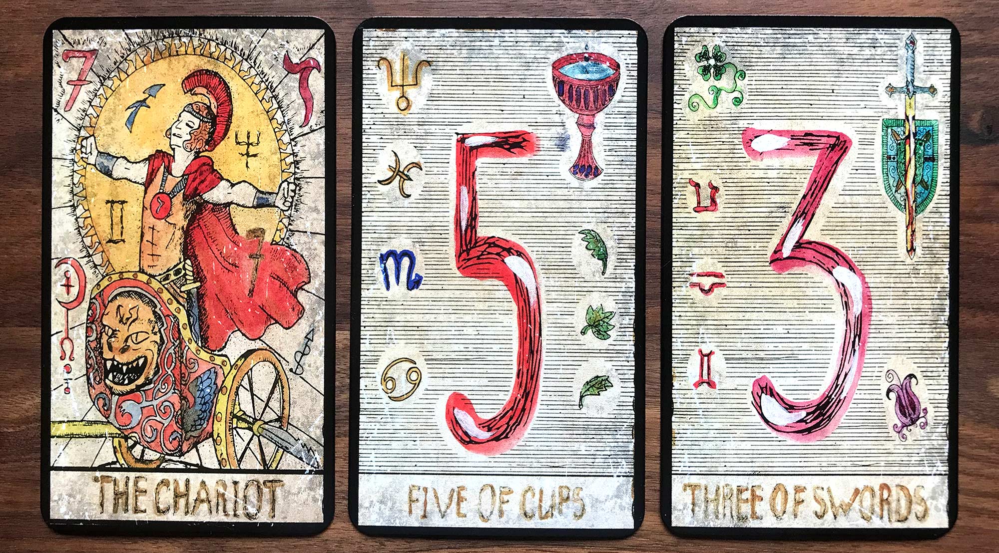 Reading Summary: Determination to move forward (The Chariot) regardless of the fact that inner demons may try to stand in the way (Nine of Swords) of my enjoyment of the journey (The Fool). Fear of the unknown (The Moon) is the only thing that keeps me from enjoying a piece of that child like joy (Six of Cups).