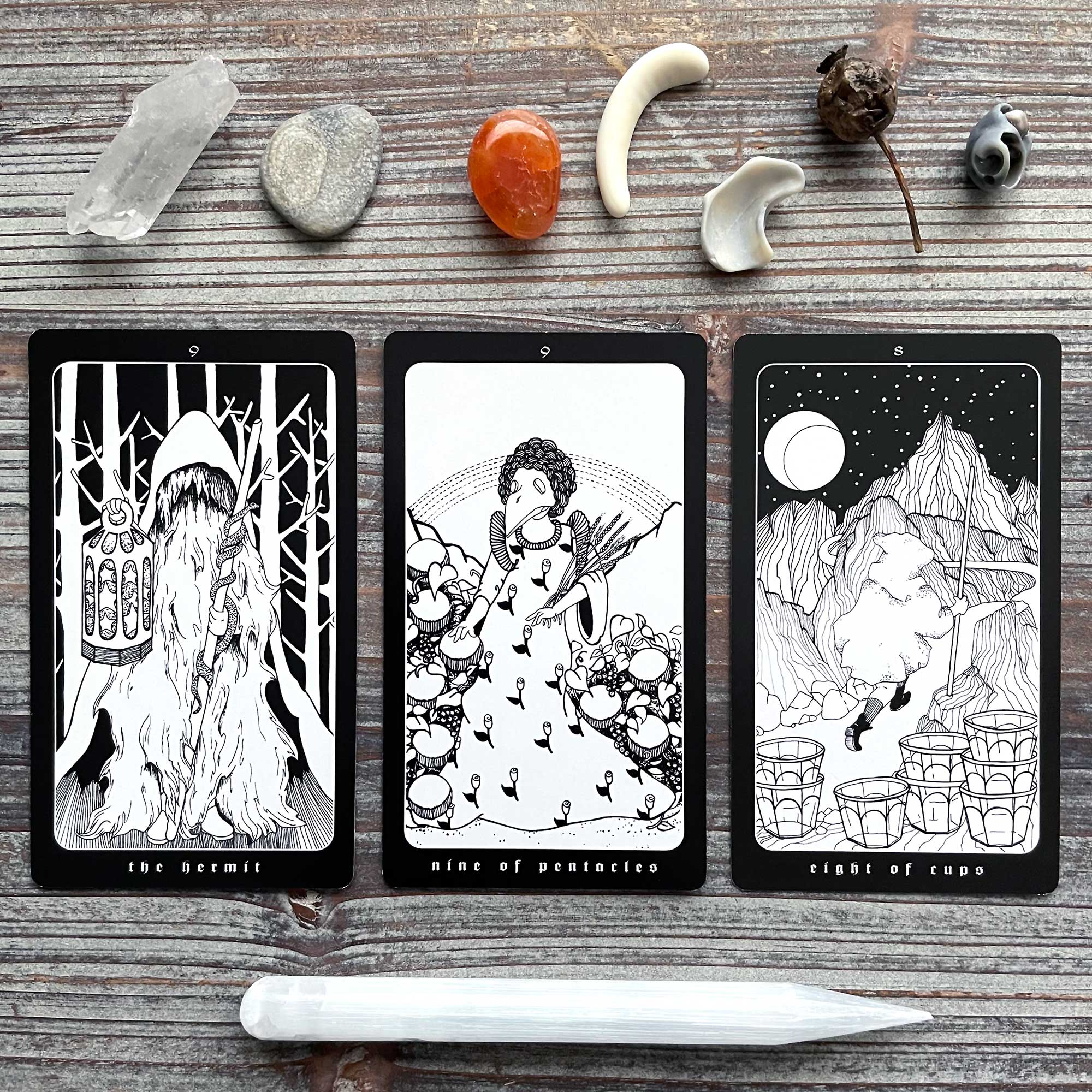 Reading Summary: Healthy alone time (The Hermit). Gratitude (Nine of Pentacles). Getting worked up to the point where I say “Fuck it, I’ll do it my own damned way” (Eight of Cups).