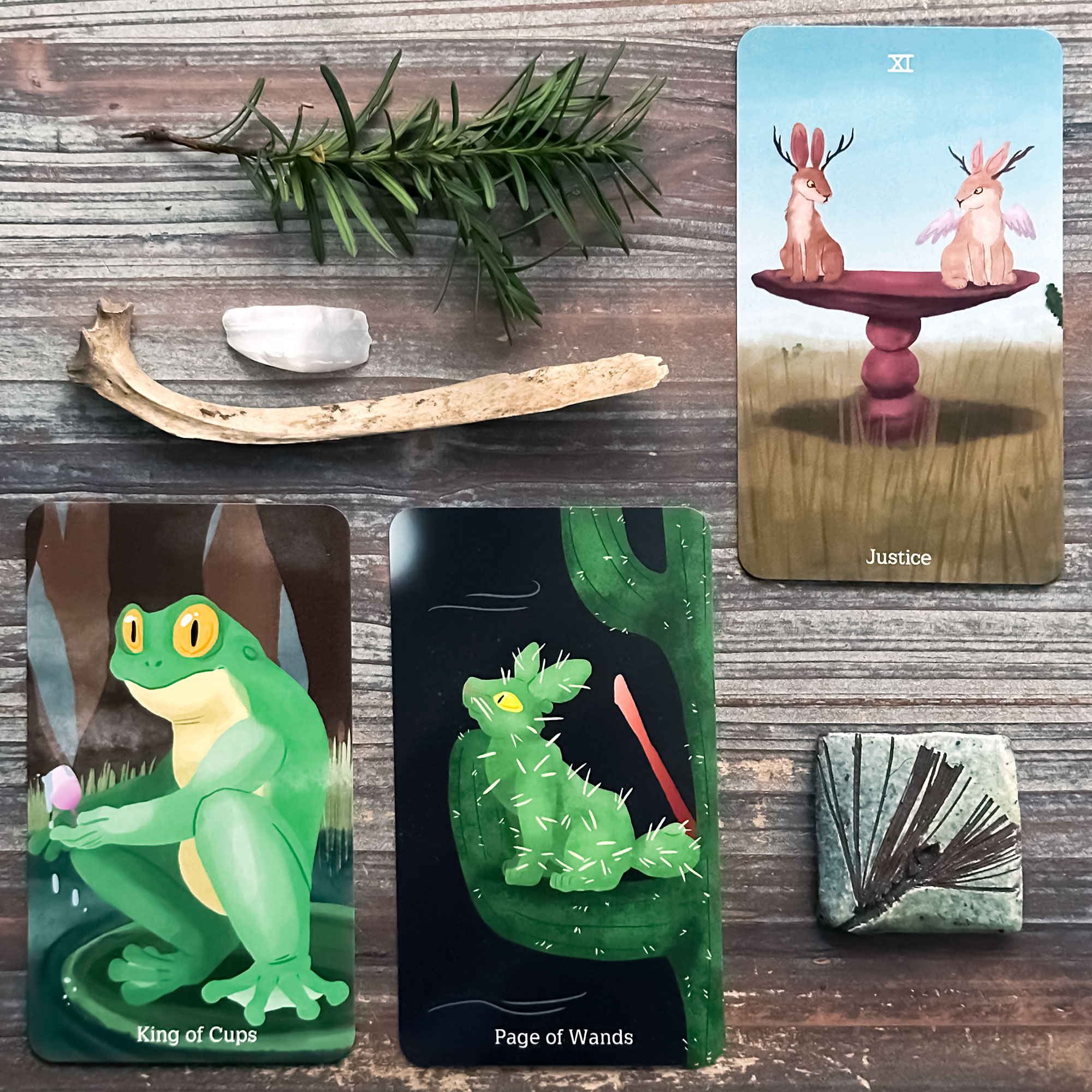 Reading Summary: Your partner still has lots to teach you (King of Cups / Loveland Frog) not just about your emotions but also your passions (Page of Wands / Cactus Cat). You get out of your relationship what you put into it (Justice / Jackalope and Wolpertinger).