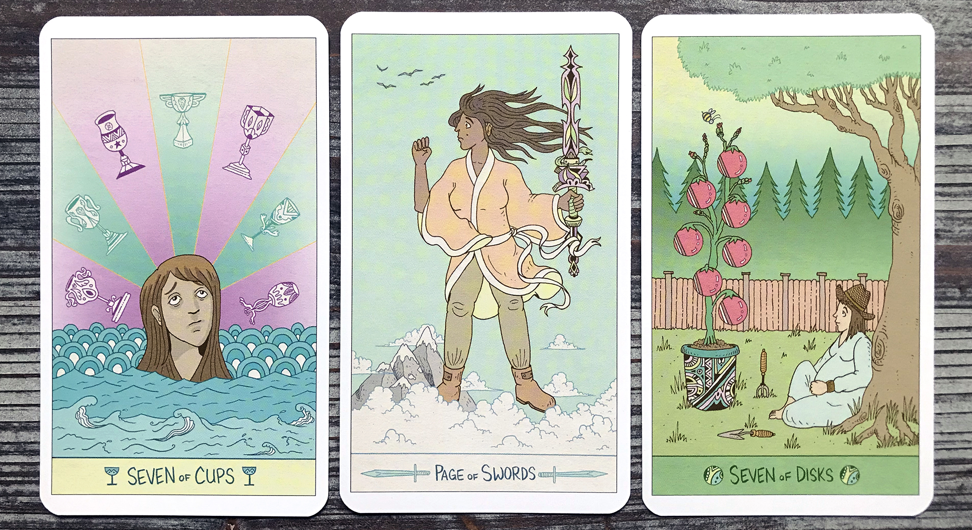 Reading Summary: Focus on my skills and those things under my control (Eight of Discs). Take time to plan ahead (Two of Wands), but not from a defensive stance, but from one of innovation toward the future (Page of Discs).