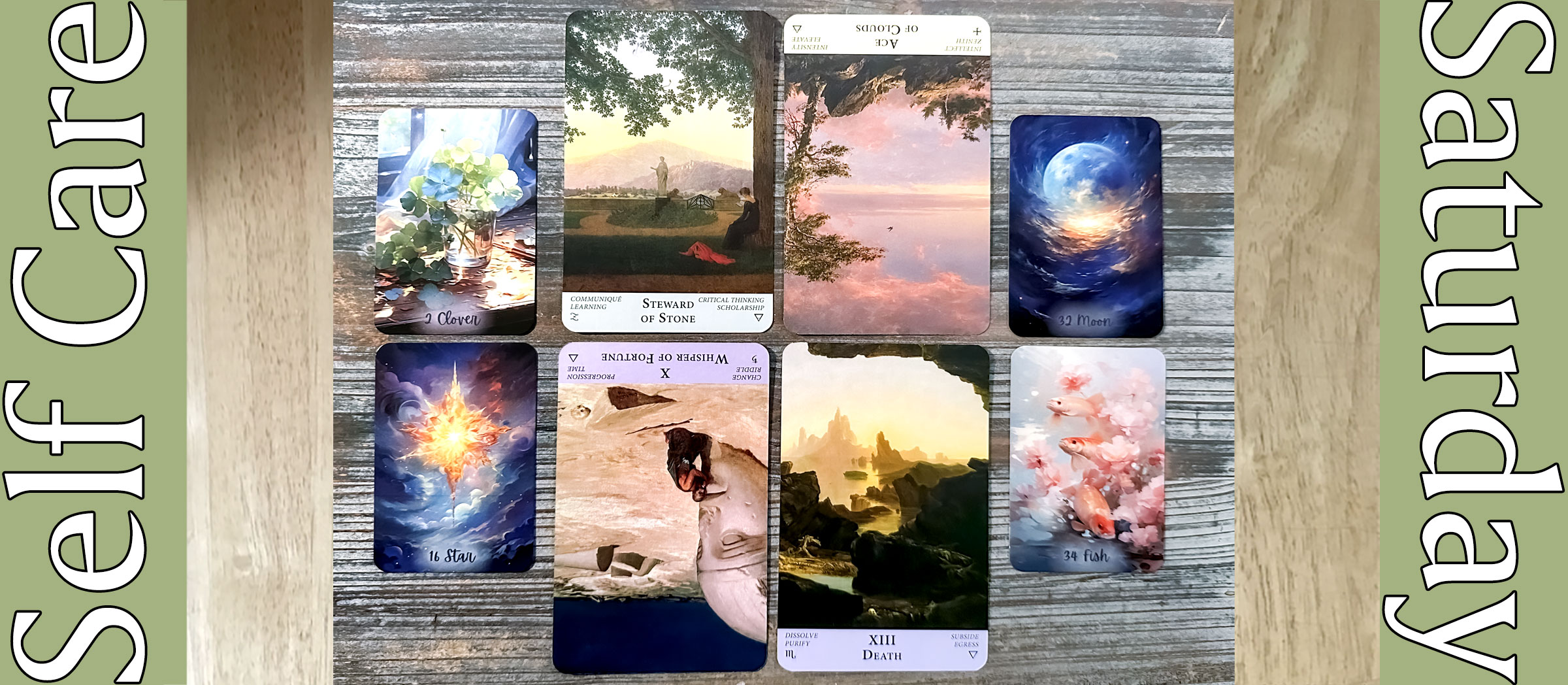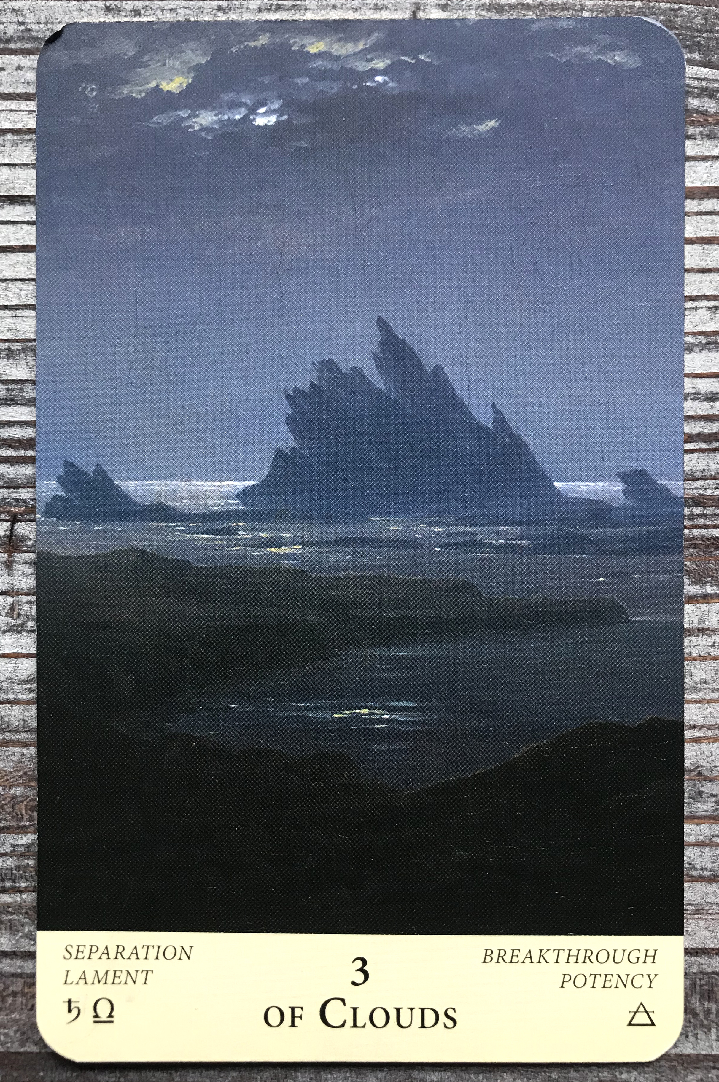 The appearance of the Spirit of Clouds in today’s draw ties into the theme of today’s meditation. When I look at the image on the card, what I see is the beaten and battered earth, the torrential rains, and stormy clouds above… and the clearing of the storm in the distance.