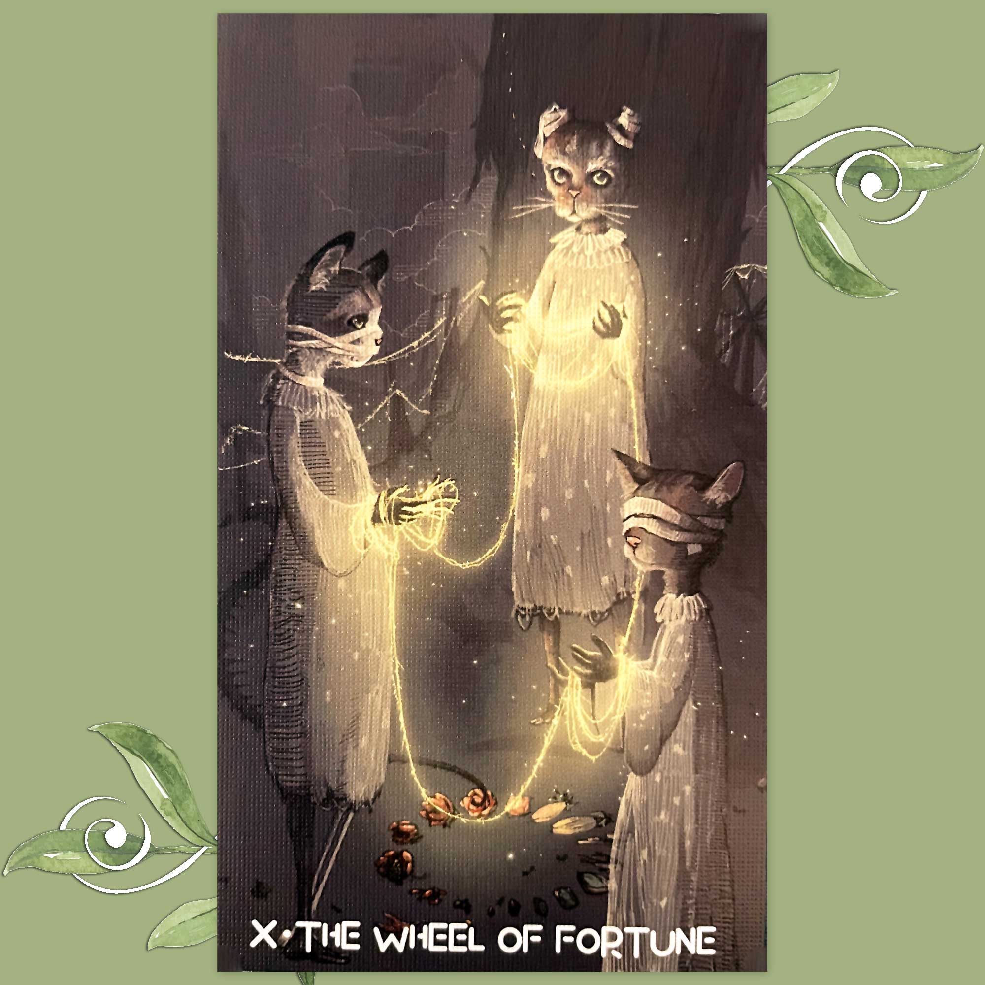 In this card we see a depiction of the Mœræ (three sisters of fate)… with cat heads. And, just like the Mœræ, cats are also extremely fickle, so I find the imagery to be an absolutely perfect representation of that fickle, unpredictable nature that the Wheel of Fortune often represents.