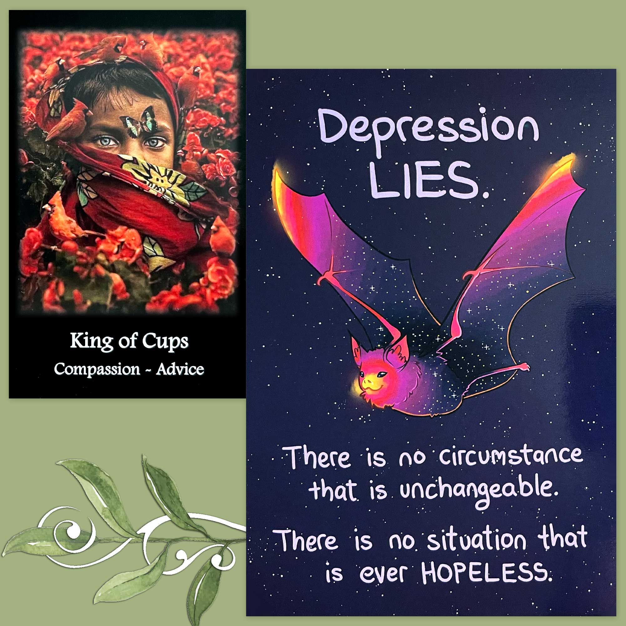As the Thera-Pets card says, depression lies. The advice between the two cards today is to make sure that you are checking in with those that you deeply trust for reality checks during times of low mood and dips into depression. Reach out to those that are supportive and offer strength for you emotionally. You need this support right now to help in keeping you from believing depression’s lies, and sinking deeper as a result.