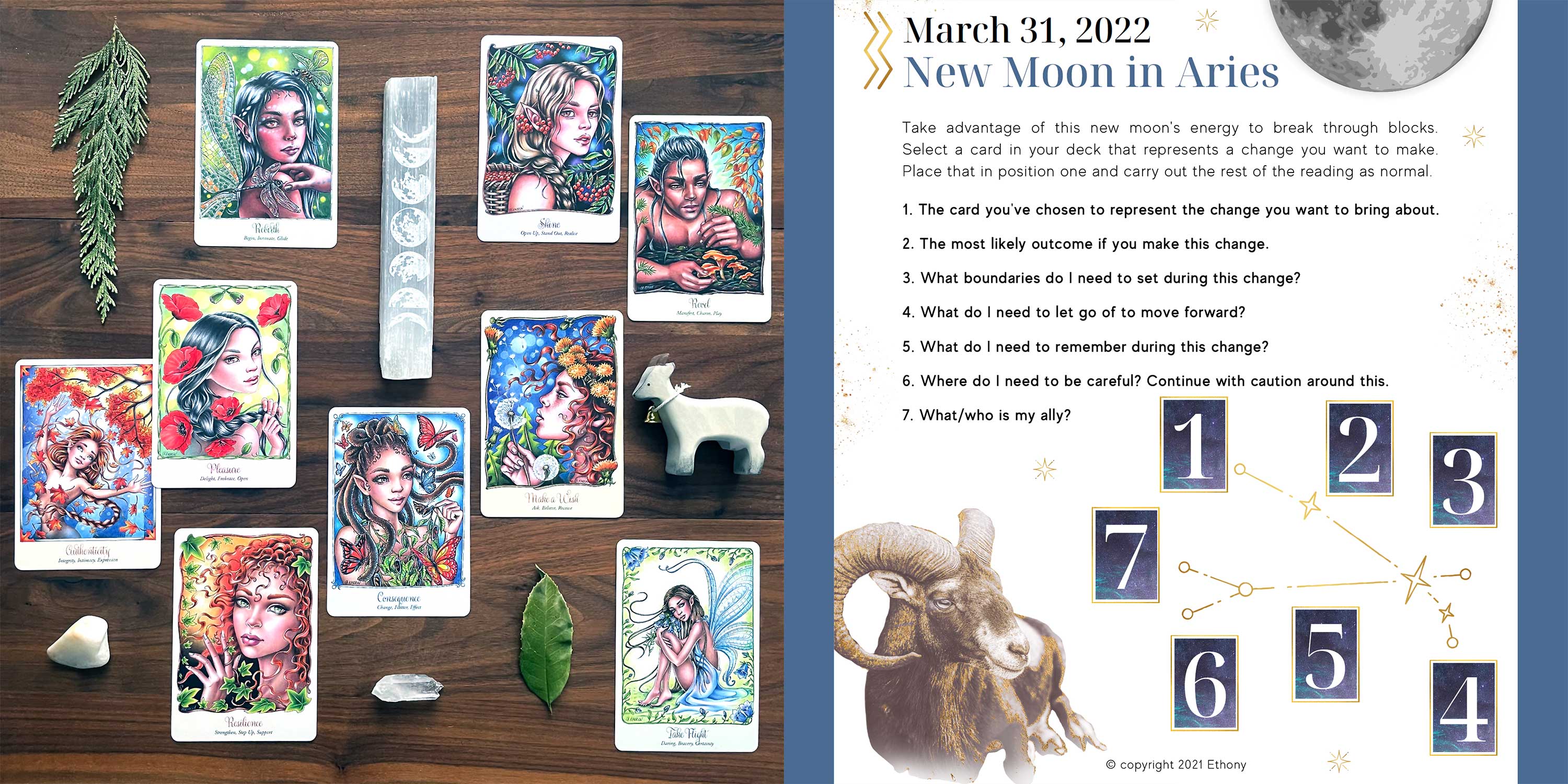 Tonight is the new moon, and like all new moons and full moons, I did a spread aligned to the moon’s current themes as a part of my recognition of the moon’s cycle and influences upon us. Todayβs spread is courtesy of Ethony.