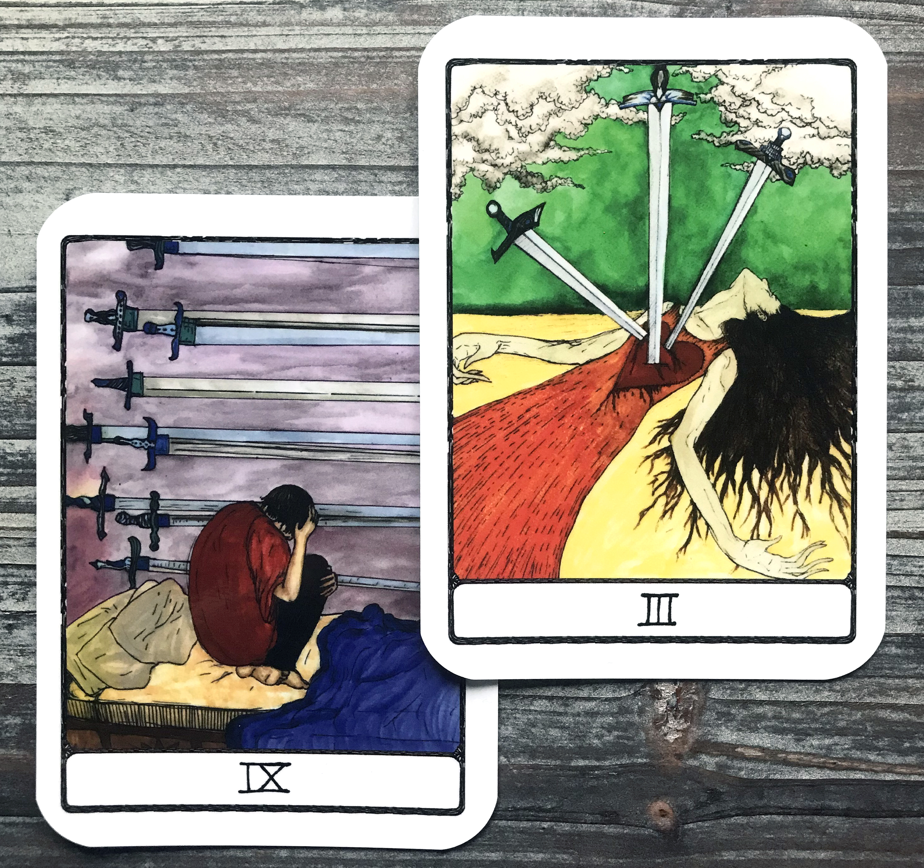 Today’s draw is the Nine of Swords, which is traditionally a representation of anxiety, insomnia, and struggling with one’s inner voice and worries.