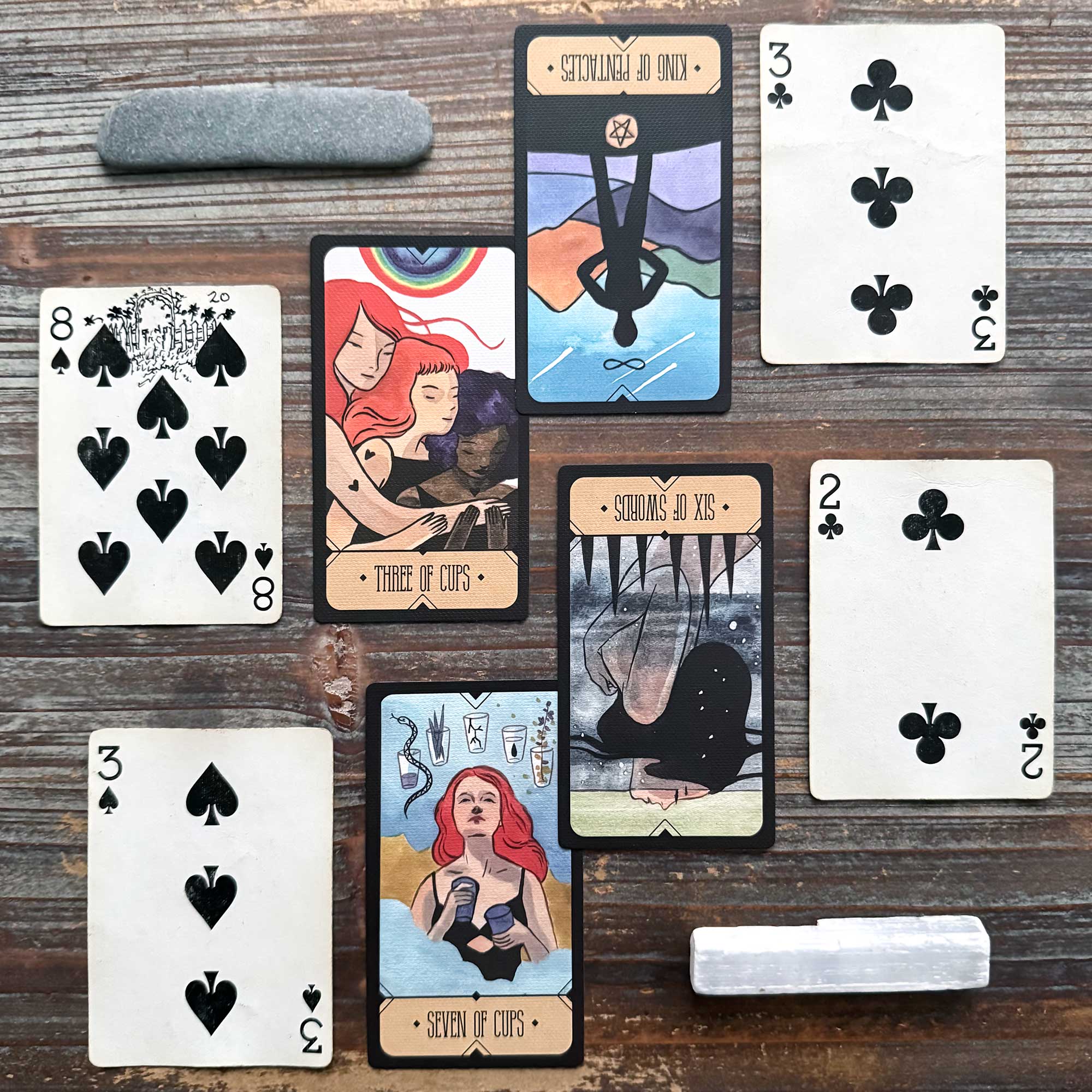 Reading Summary: You want to stay home today (Four of Clubs), and you accept that just because you don’t like the consequences of the choices in front of you (Five of Diamonds) doesn’t mean that you don’t have choices (Seven of Hearts).