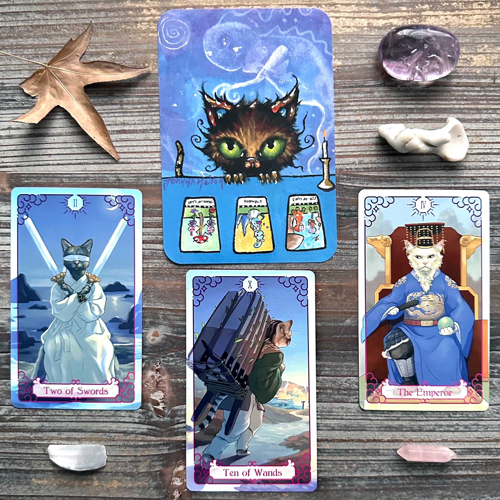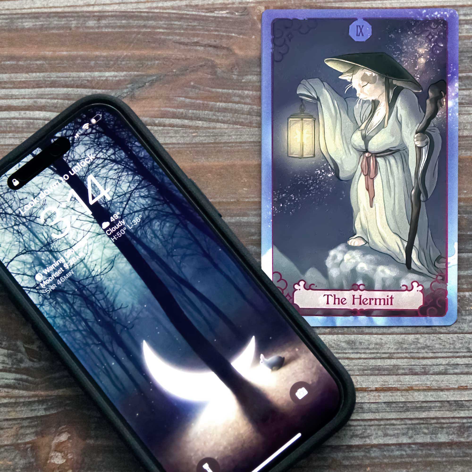 The Hermit atop Page of Swords – Take some time to reflect on times when you have been too impulsive. Reach out and connect with these past lessons to assist you in avoiding repeating them.