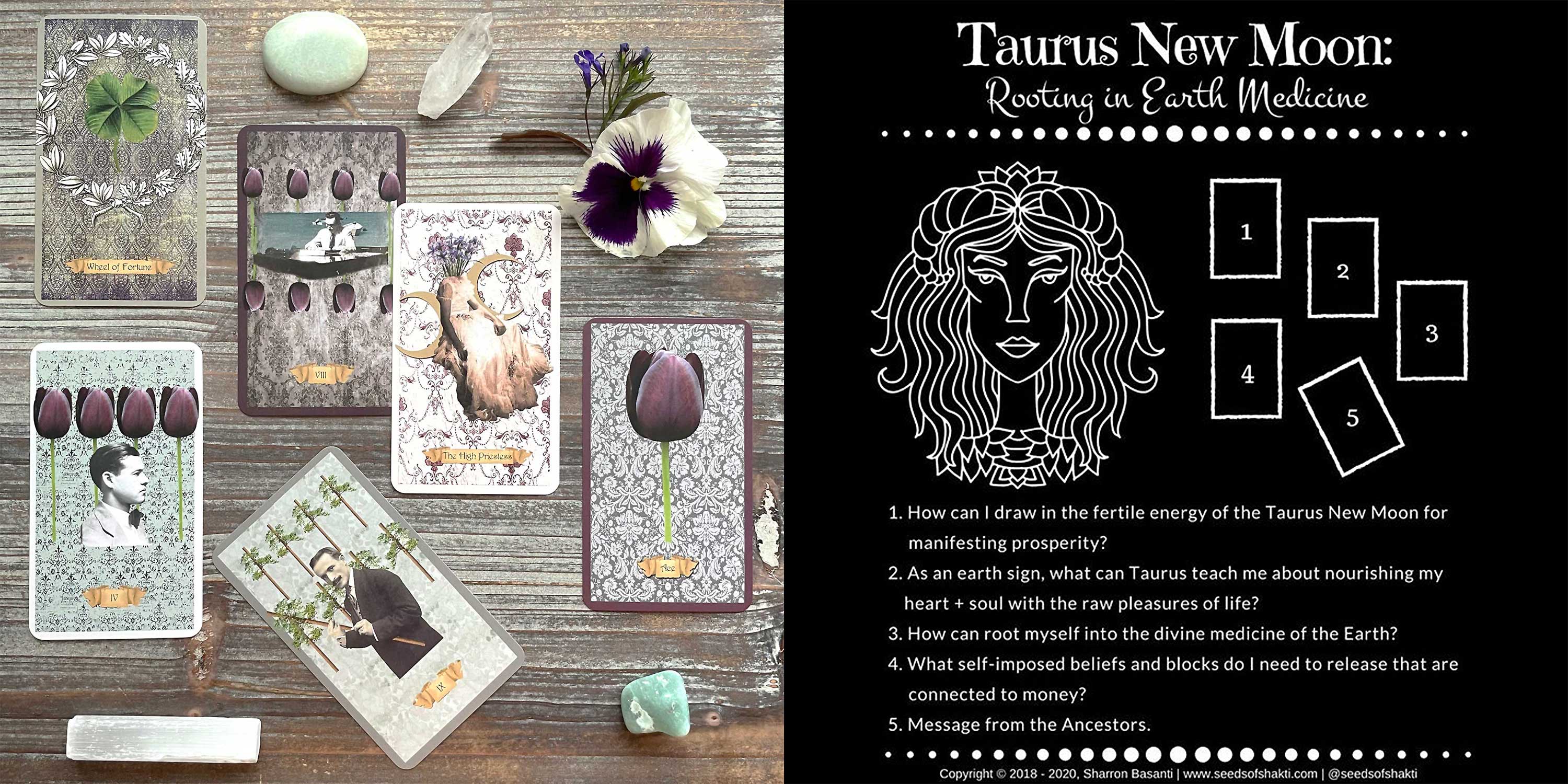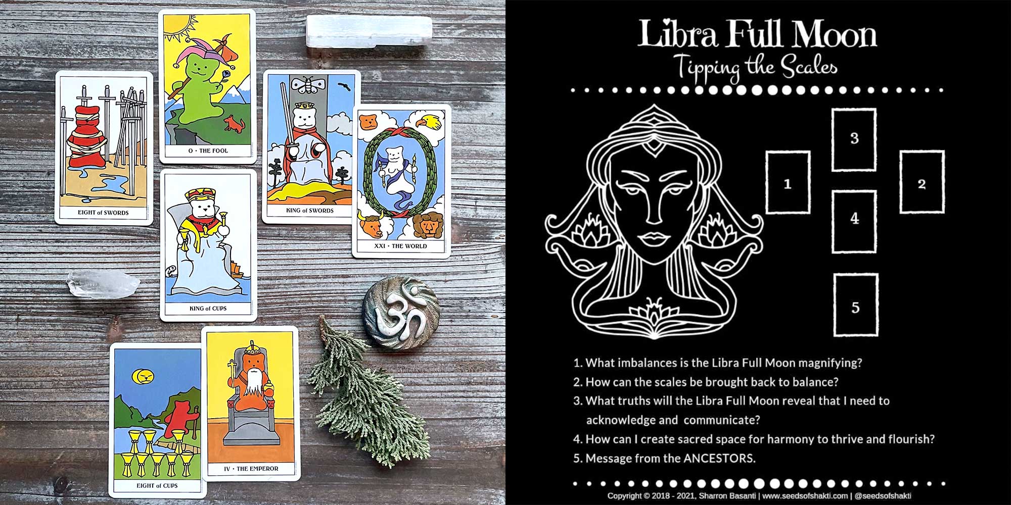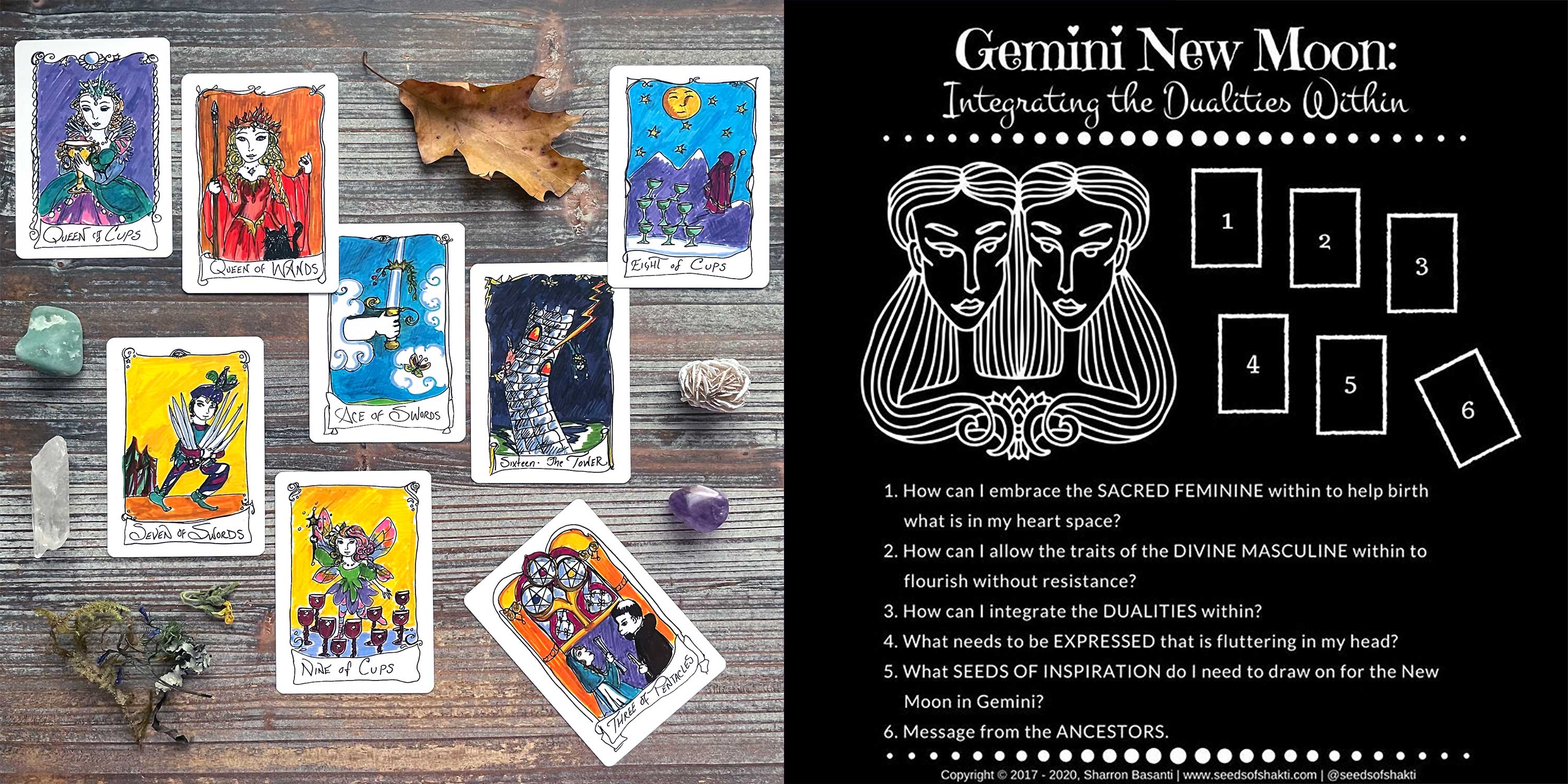 Tomorrow is the New Moon, and like all new moons and full moons, I did a spread aligned to the moon’s current themes as a part of my recognition of the moon’s cycle and influences upon us. Today’s spread is about integrating the qualities within, and brought to you by Sharron Basanti of Seeds of Shakti.