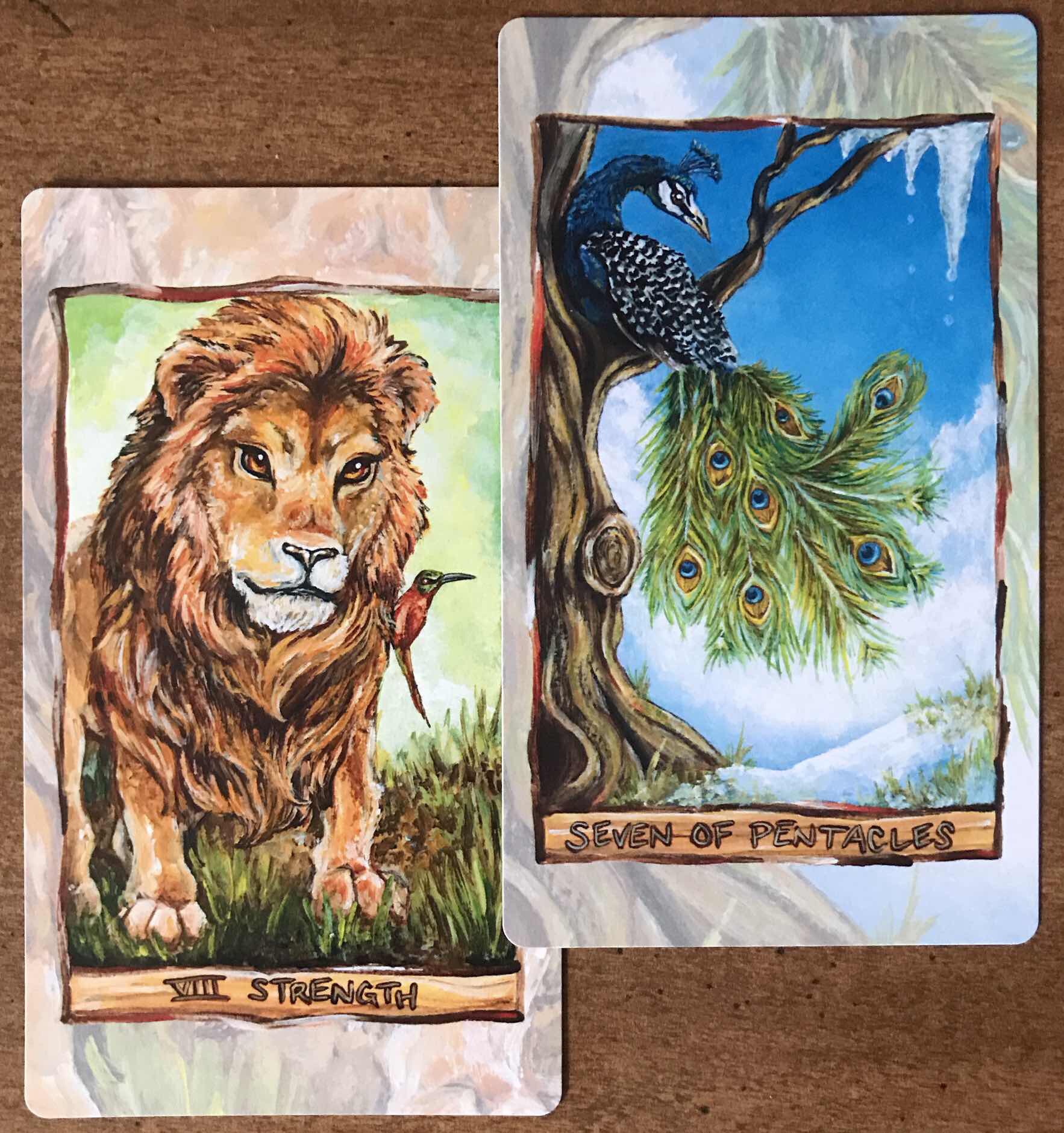 Today’s draw is (again) a double without a jumper. In today’s draw we have the 8th card (in some decks this is the 11th card) of the Major Arcana, the Strength card which is represented here by a bee eater bird and a lion. With the Strength card came the Seven of Pentacles, which in this deck is represented by the peacock.