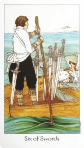 Today’s draw is the Six of Swords, which is a representation of transition and change in the area of thought, reason, instinct, and communication.