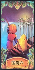 Today’s draw is the Six of Swords, which is a representation of transitions and change in the area of thoughts, ambitions, communication, and logic.