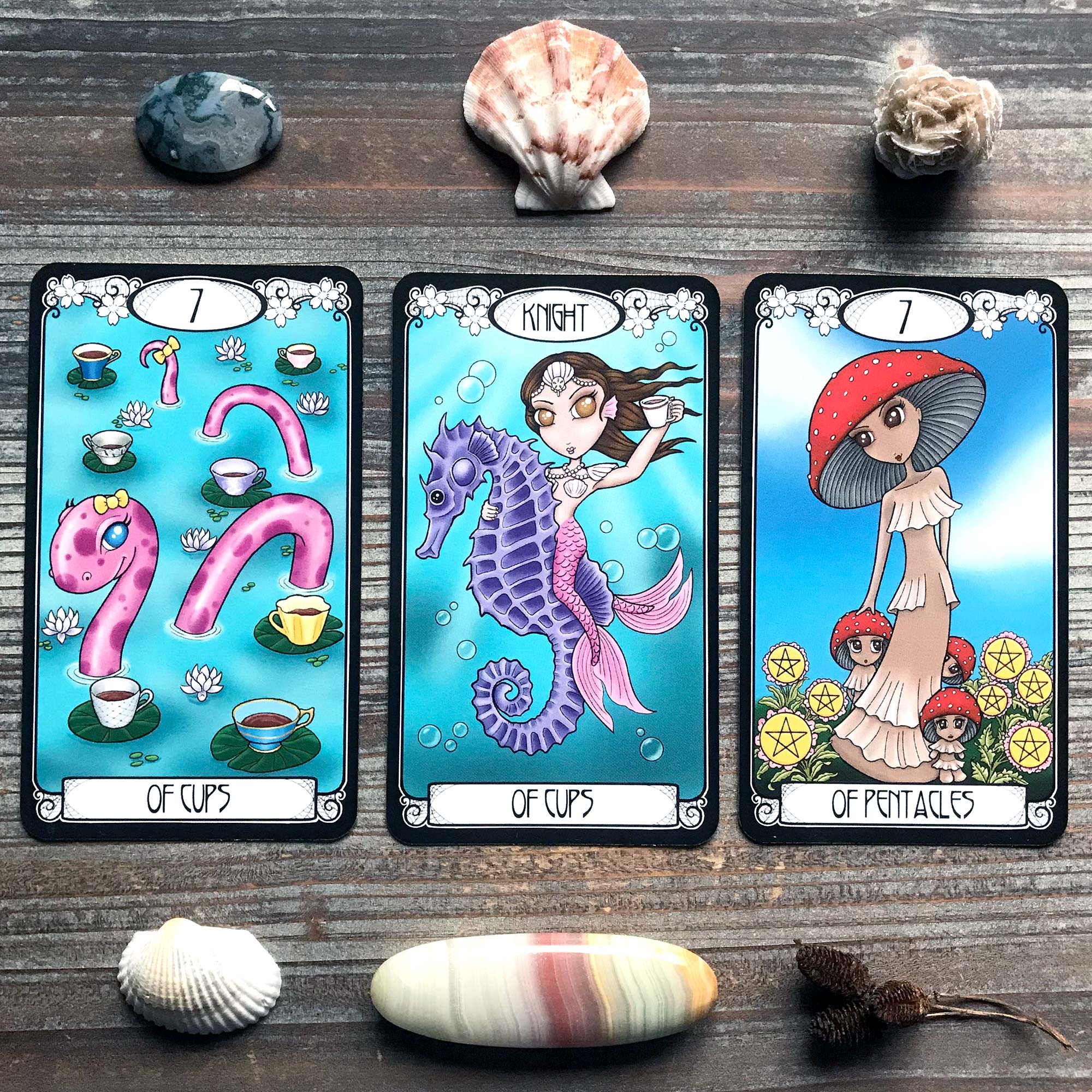 There is a connection between the Seven of Cups and the Knight of cups in both coloring and theme. This goes beyond the “Cups” suit correspondence and into how the two cards flow together. Pick one cup. Just one. And go after it full force.