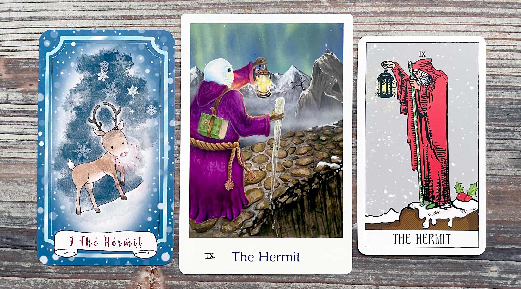 Prompt: “Pull the Hermit card from your deck(s). Compare the imagery between the card provided below and the card(s) from your own deck(s). How would you read them differently and why?“
