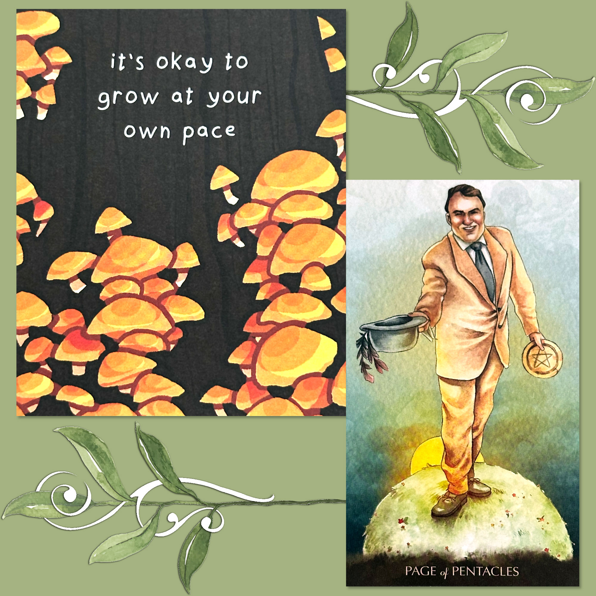 Today’s draw is the Page of Pentacles combined with the affirmation “It’s okay to grow at your own pace.”