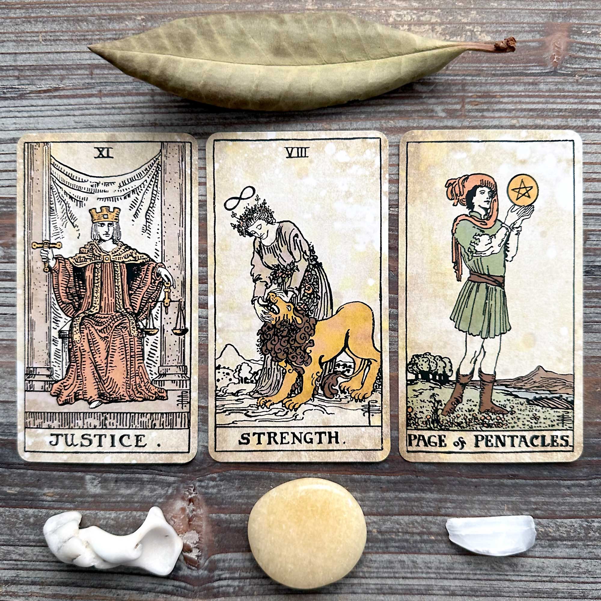 Reading Summary: When it comes time to reap what you sow (Justice), a bit more smart and sexy can help convince (Strength) those coming for you to slow down and look at things in a more positive light (Page of Pentacles).