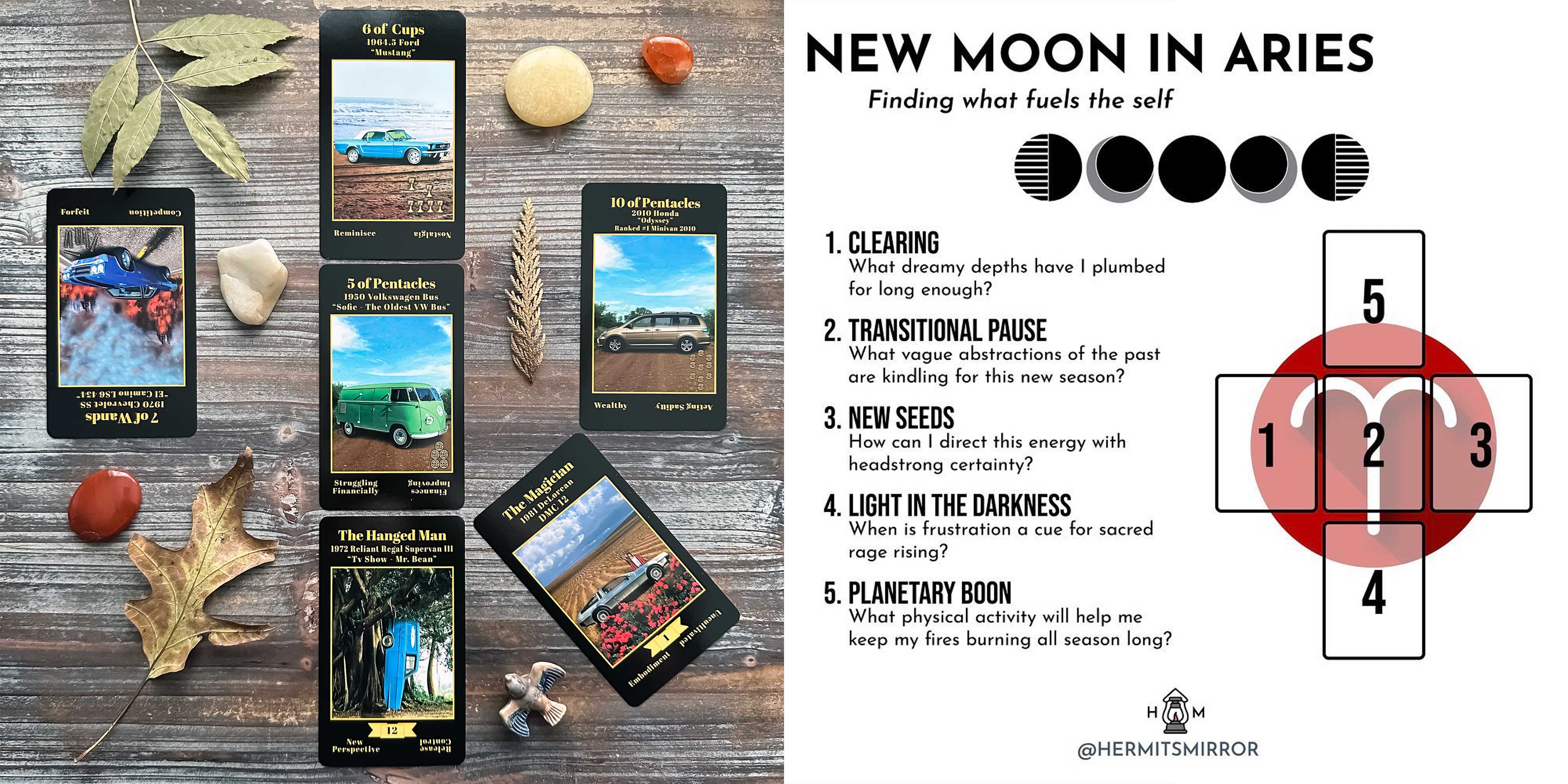 Tomorrow is the new moon, and like all new moons and full moons, I did a spread aligned to the moon’s current themes as a part of my recognition of the moon’s cycle and influences upon us. Today’s spread is brought to you by the Hermit’s Mirror.
