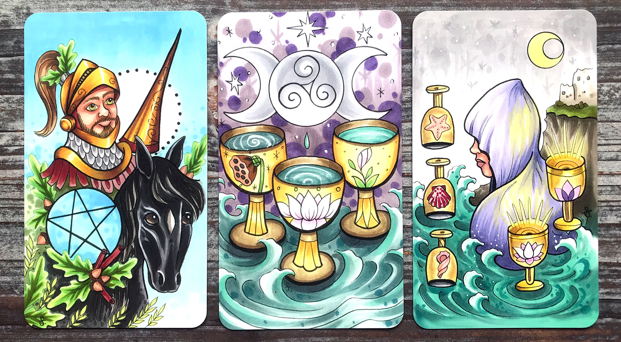 Reading Summary: More fun (The Sun) combined with the assurance of slow and steady stability (Knight of Pentacles). Don’t let uncertainty (The Moon) turn you harsh and your inner critic vicious (Queen of Swords Rx).