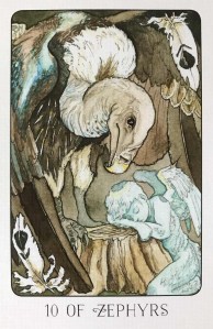 Today’s draw was the Ten of Zephyrs, which is a representation of endings, restoration, and resurrection (among other more negative connotations) in the areas of intellect, the mind, logic, education, and instinct. Some of the more negative meanings include resisting closure, painful endings, deep wounds, and betrayal. The other side of this coin, though, is that it is also a card of recovery, healing from said wounds, and moving on.