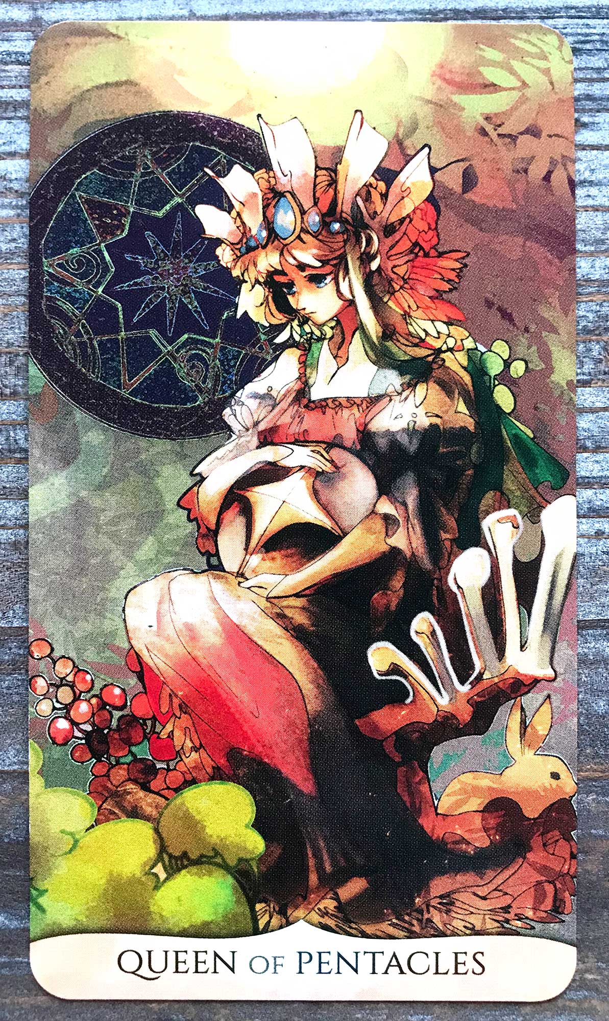 Today’s draw is the Queen of Pentacles, which is traditionally a representation of a receptive alpha energy, personality, or person in the area of one’s finances, home life, health, resources, and manifestations.