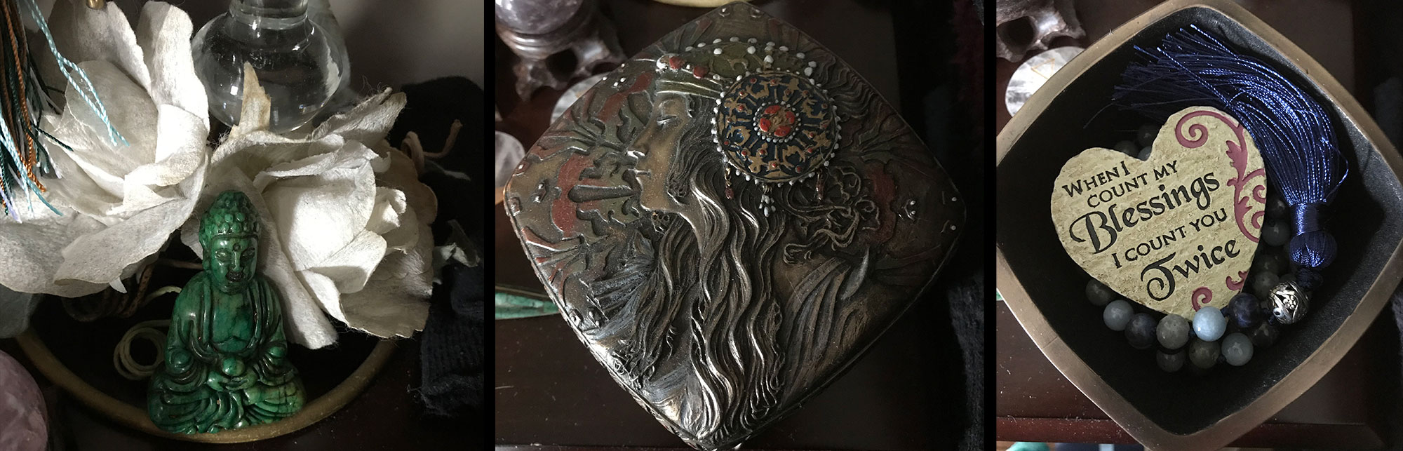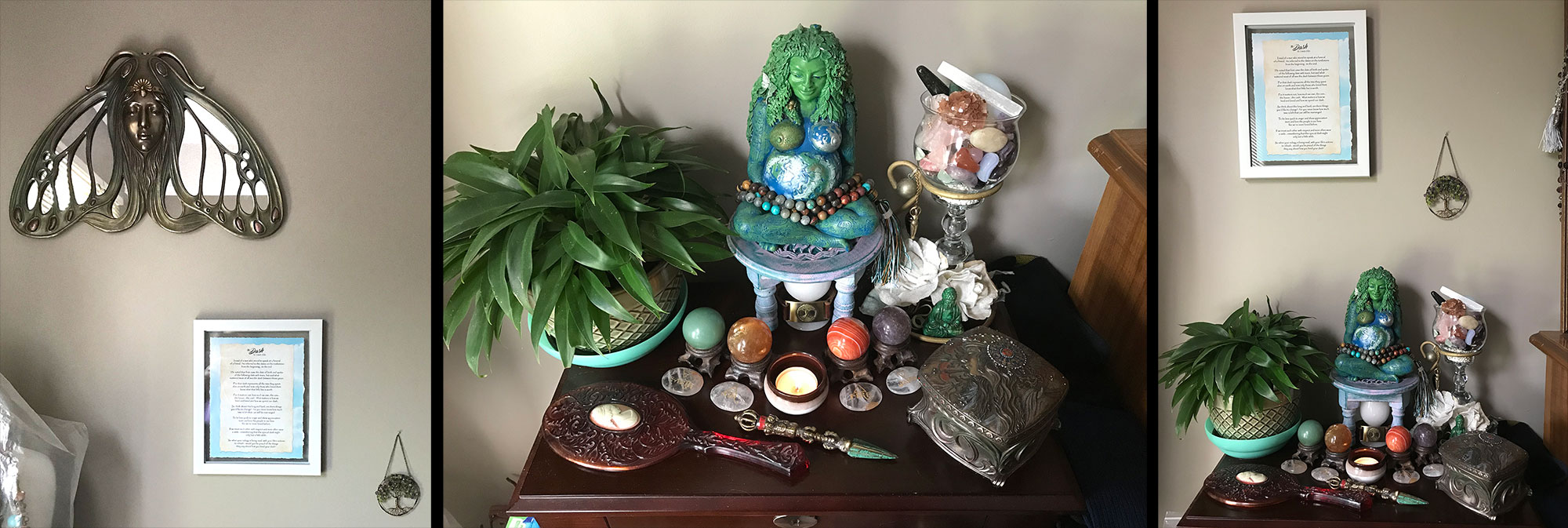 In the office I have a lot of greenery, but nothing that’s particularly sacred aside from the plants themselves. I do have a few things hung on the wall near where I package orders to remind me of my center and assist in keeping me from sinking too deeply into that “work mindset” and losing track of everything else.
