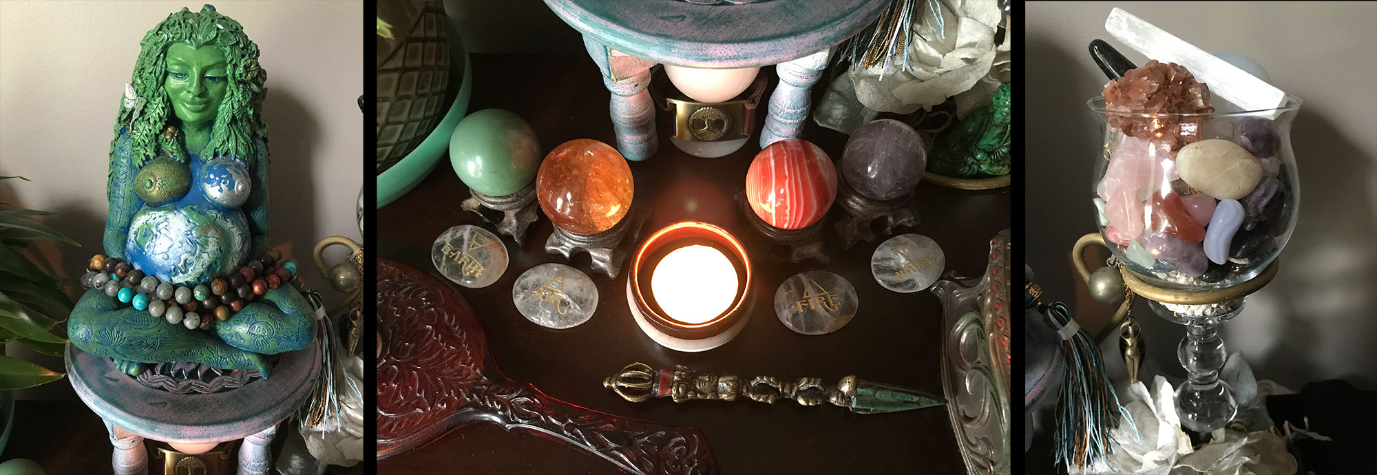 I want to say that the stuff on my altar are self explanatory, but they might not be, so I will go through them starting with the Gaia statue. I do not worship the goddess Gaia, but I use this statue as a representation of the energies of creation, evolution, and balance. Draped over her lap is a mala that has been placed there as an offering to those energies.