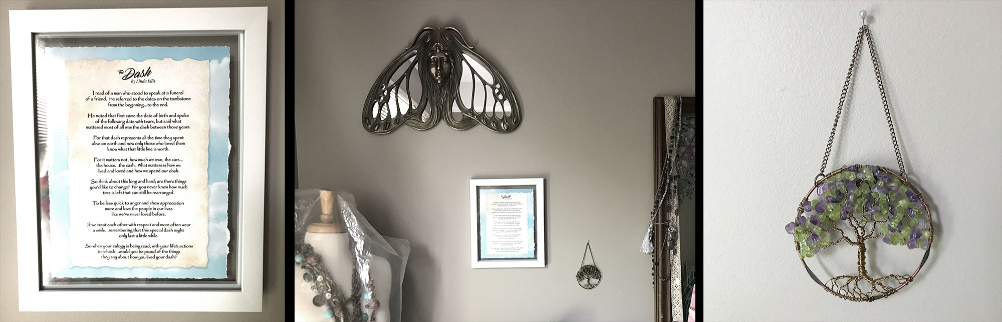 On the wall above my alter is a framed picture of The Dash that I’ve shared before with you, and a small tree of life sun catcher in amethyst and peridot. Above that to the left is a new addition. That is my beautiful moth woman, which I was given recently by Z and matches the intention box on the altar.