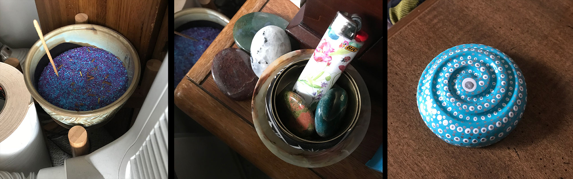 Then, on the shelf below the altar, you can find usually a collection of larger gemstones, my agate offering bowl, a painted rock with spiral design that I found in a post office parking lot, the tarot deck I’m using for my daily pulls, etc. To the left of that on a plant stand is a planter filled with (currently very colorful) sand where my burning incense is safely used.
