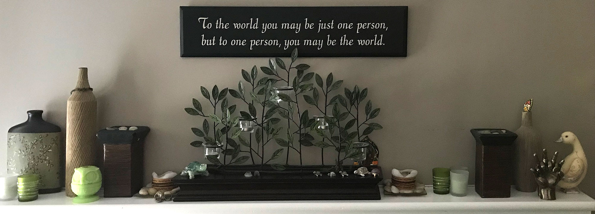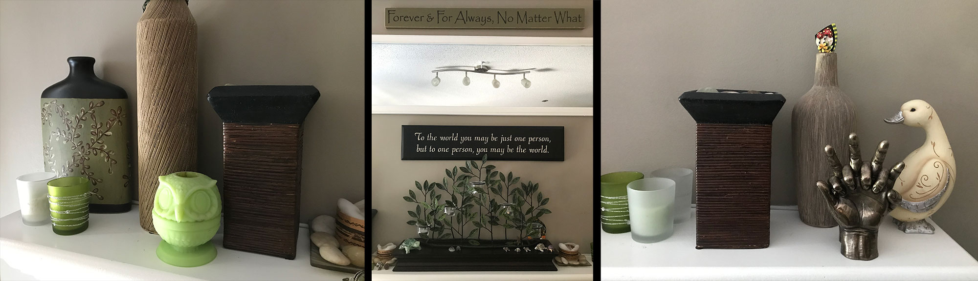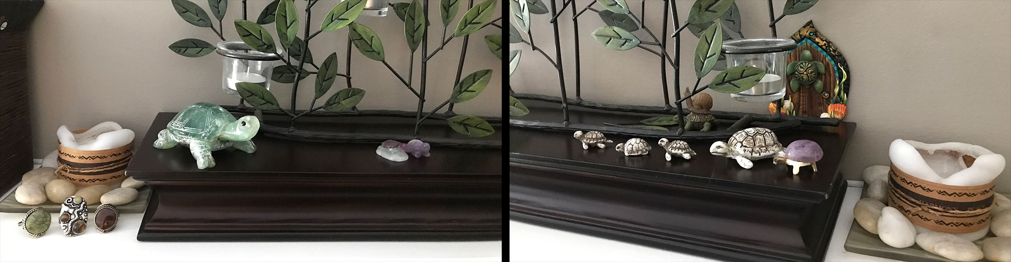There is the mantle above my fireplace, where I also have a handful of the gifts you have given me over the years, as well as candles and crystals, a fairy door, and a parade of turtles that always remind me of you. There is also my goose, the newest gift you gave me of the holding hands, and a few other small items (including a blown glass turtle pendant that matches the one I sent you hanging from the vase on the left that is for some reason currently facing the wall).