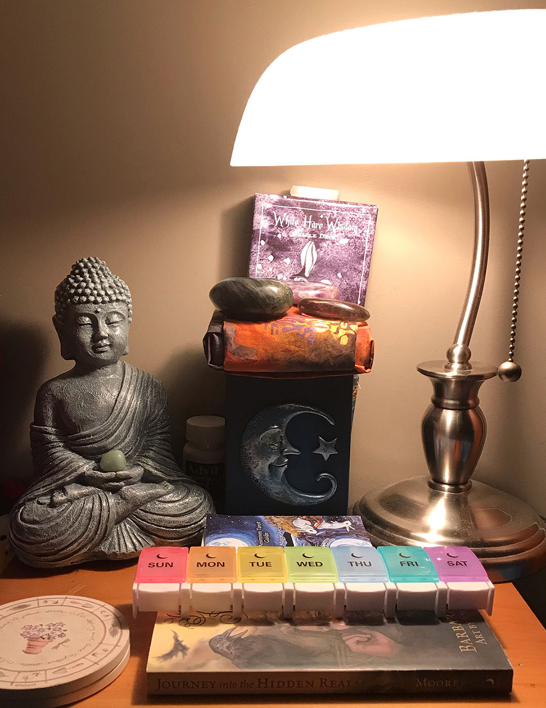 There is also my concrete Buddha (holding a piece of green calcite) on the other nightstand beside the bed, along with a moon box which holds a couple of malas in it, and a stack of a few decks I use monthly.