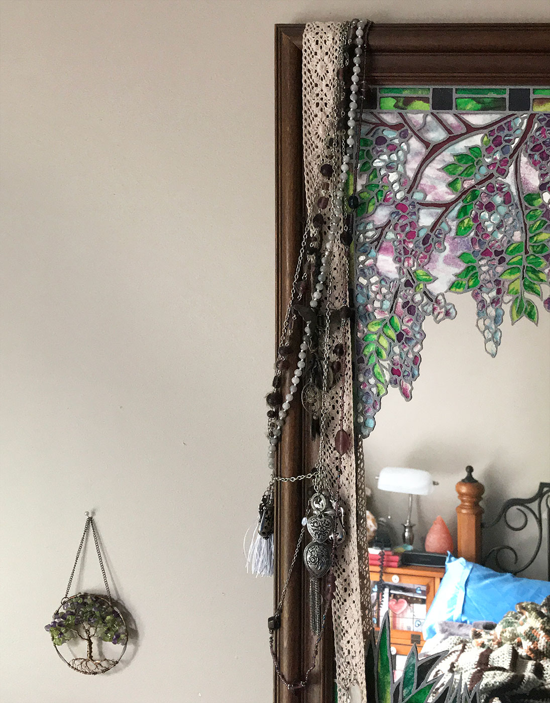 Here is the last of the bauble traps currently in my home, and I’ve mentioned this one on the blog in the past. This is near the front door at the other end of the short entry hall. It is not visible from the front door, but catches light from windows across the room. Like the one in the bedroom, I didn’t manage to get a really good shot of the items reflecting the light due to the time of day I took these photos.