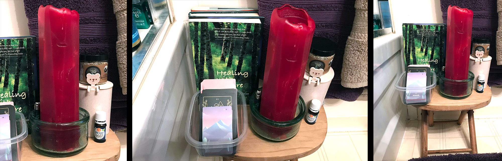 This little space contains a bin that holds two waterproof tarot decks and one waterproof lenormand deck. There is also a large pillar candle (that made myself at Ms B’s house), a wheat-straw teddy bear mug holding a collection of essential oil bottles, and a few books for when I feel like doing a little reading while I marinate in the tub.