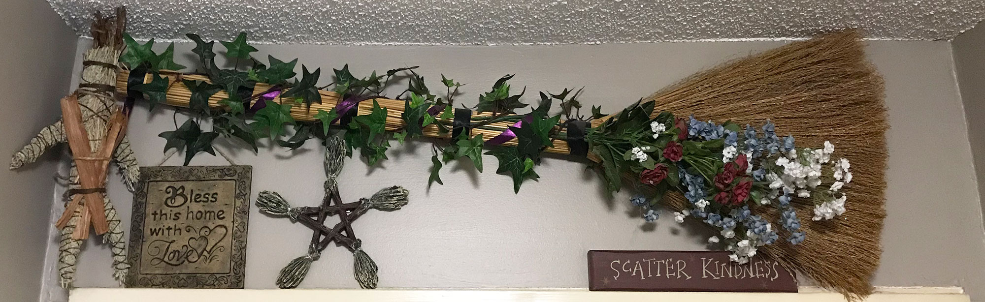 Here is the entry to my home, or rather, what resides above the entry. On the left, you have my sage and cedar poppet for protection and a besom pentagram, both of which came in last month’s Witches Box subscription. The rest of the stuff up there has been there for years and includes broom (besom) that Z made for me when I moved into this space, and two plaques that my sister and I set with intentions each year.