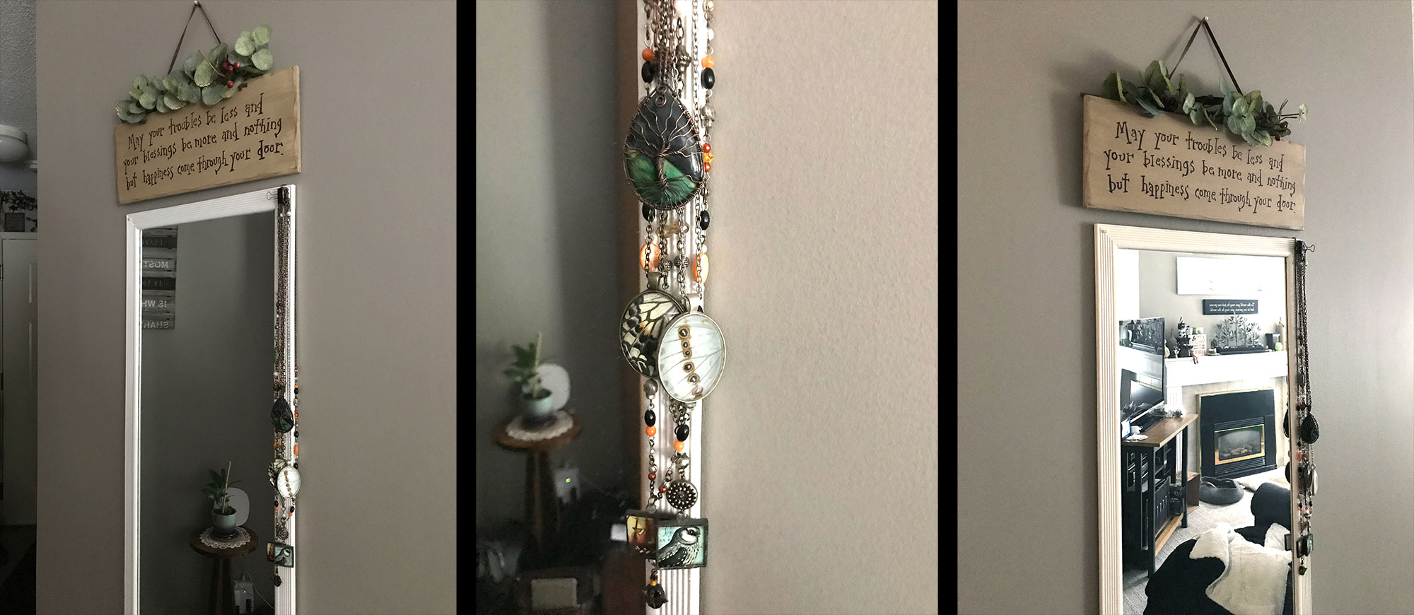 Beside my altar, I have a large mirror with a bauble trap set up there for mischief makers to busy themselves with (so that they aren’t playing with the stuff on my altar). I’ve added a picture, but I’ve found that I had a hell of a time figuring out how to get it to show the simmer on the baubles, so they look a little dark. You can click the picture to get a better view though.
