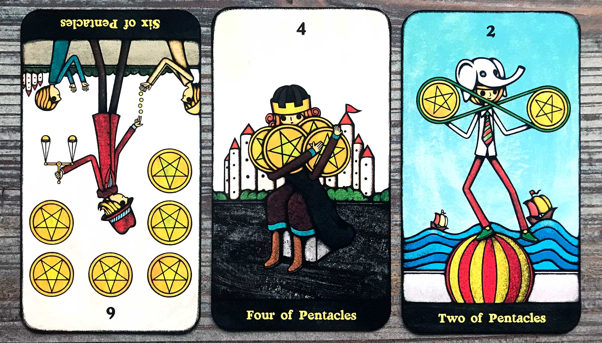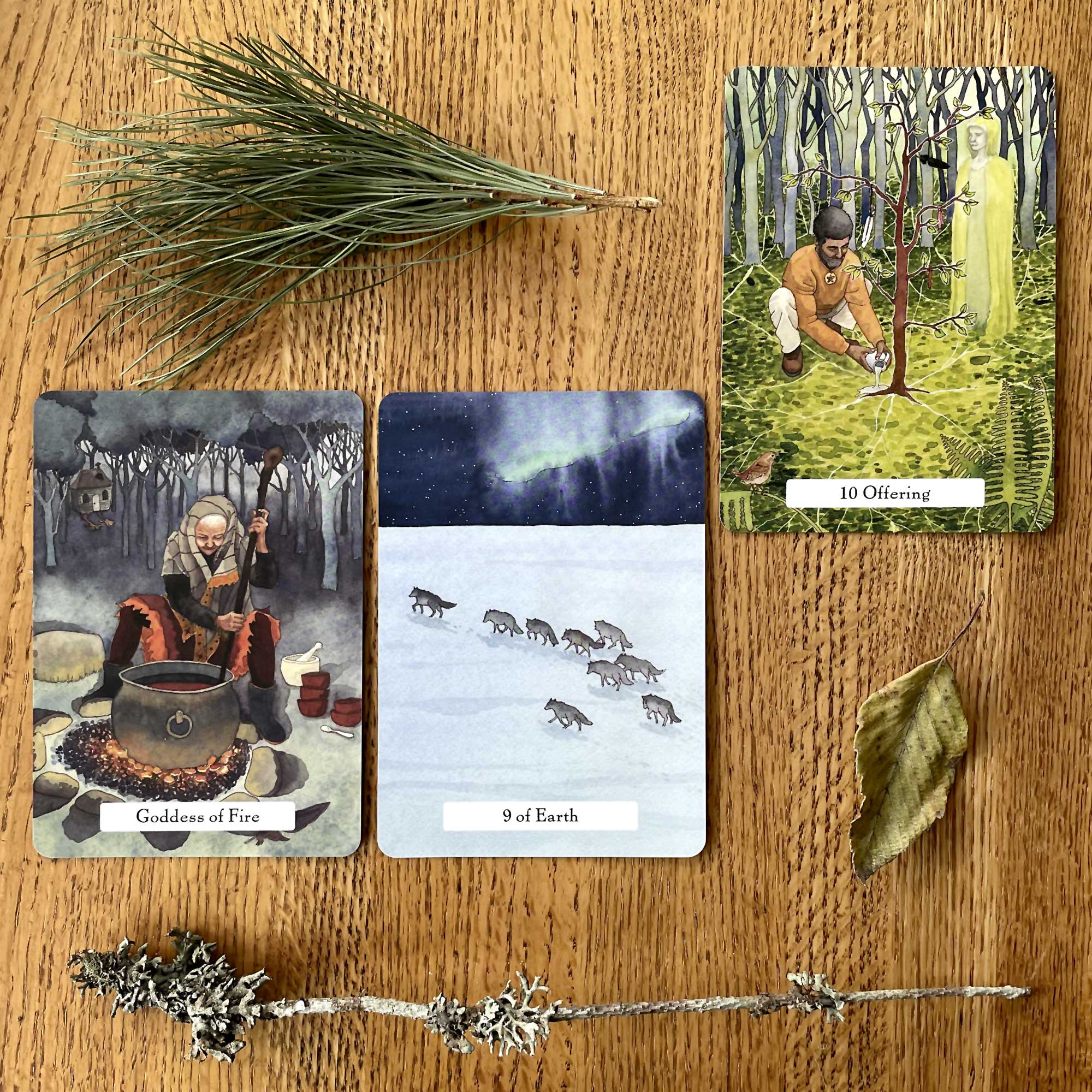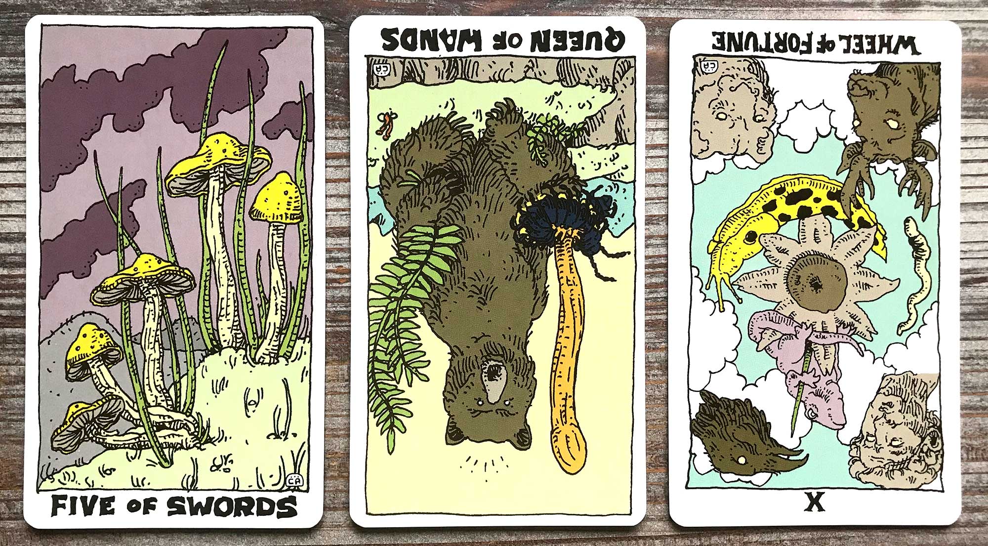Reading Summary: There is a connection between the vines the woman wears in strength, and the lush beauty of the Ace of Cups. This speaks of having the strength to work through newness, especially when there is an overlap into the Page of Cups Rx. Uncertainty in lighter greens bleeds up into a greater certainty in the Ace of Cups, while both of these cards speak of newness.