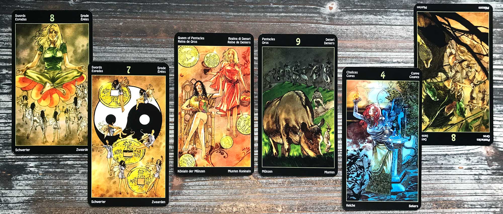 There is also a connection between the Witch of Air and the Ten of Air. In both cards, there is flight through the braids and skirt of the woman, the wings in the crows. This speaks of the ability to use your clever mind to discard and restart… the spinning of the figure indicating that this “discard and restart” may need to repeat more than once. Combined with this, there is a hint of connection in the background colors between the Strength card and the Ten of Air, speaking of the ability to use your strengths to overcome a journey that ends in unsatisfactory ways, to use what is learned to do better.