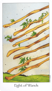 Today’s draw is the Eight of Wands, which is a representation of quick and energetic forward movement in the areas of one’s passions and enthusiasm, inspiration, and spirituality.
